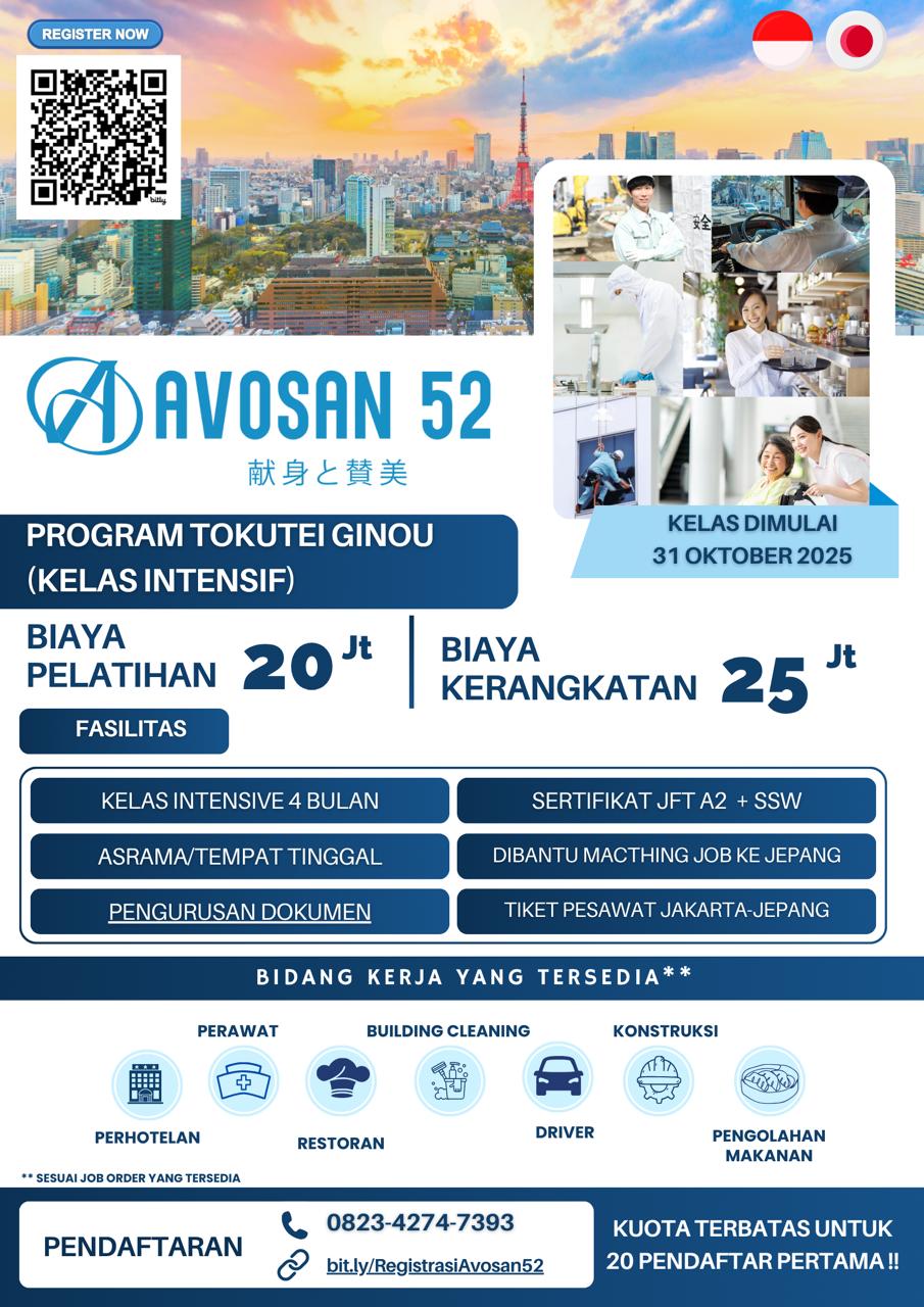 Pendaftaran Kelas Intensif Program Tokutei Ginou AVOSAN 52 telah dibuka!